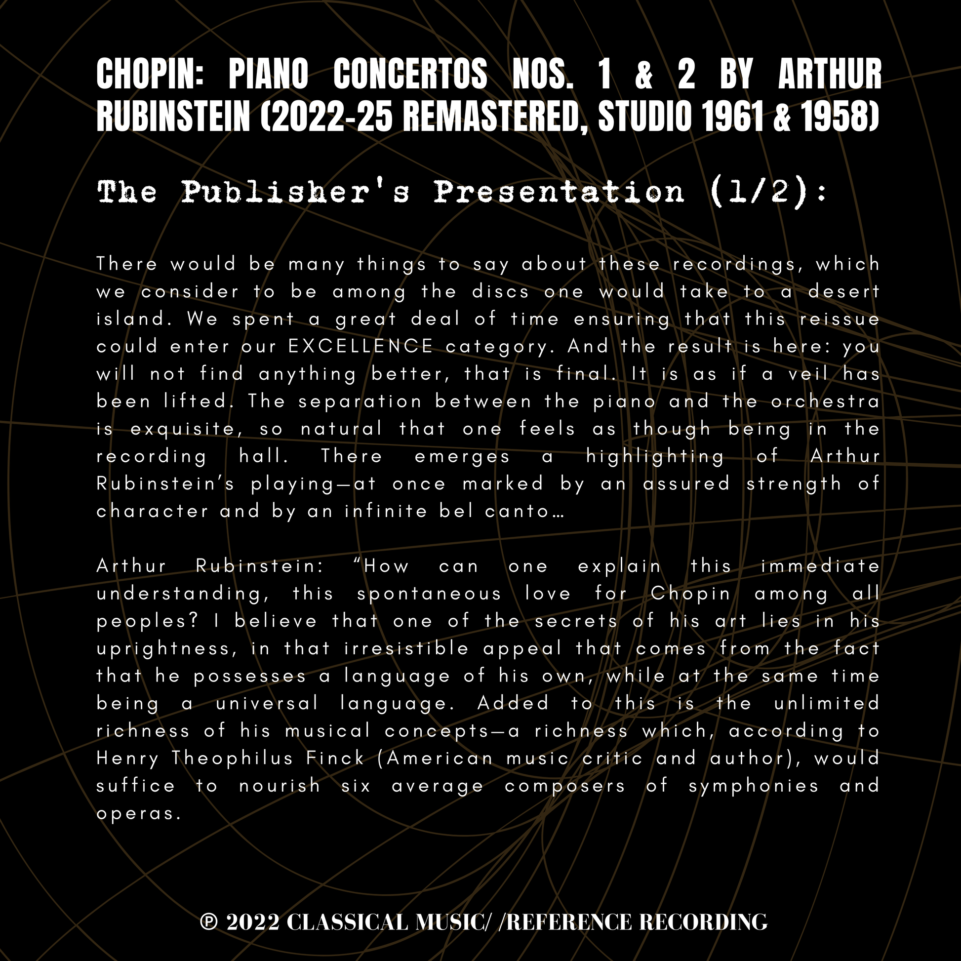 There would be many things to say about these recordings, which we consider to be among the discs one would take to a desert island. We spent a great deal of time ensuring that this reissue could enter our EXCELLENCE category. And the result is here: you will not find anything better, that is final. It is as if a veil has been lifted. The separation between the piano and the orchestra is exquisite, so natural that one feels as though being in the recording hall. There emerges a highlighting of Arthur Rubinstein’s playing—at once marked by an assured strength of character and by an infinite bel canto…