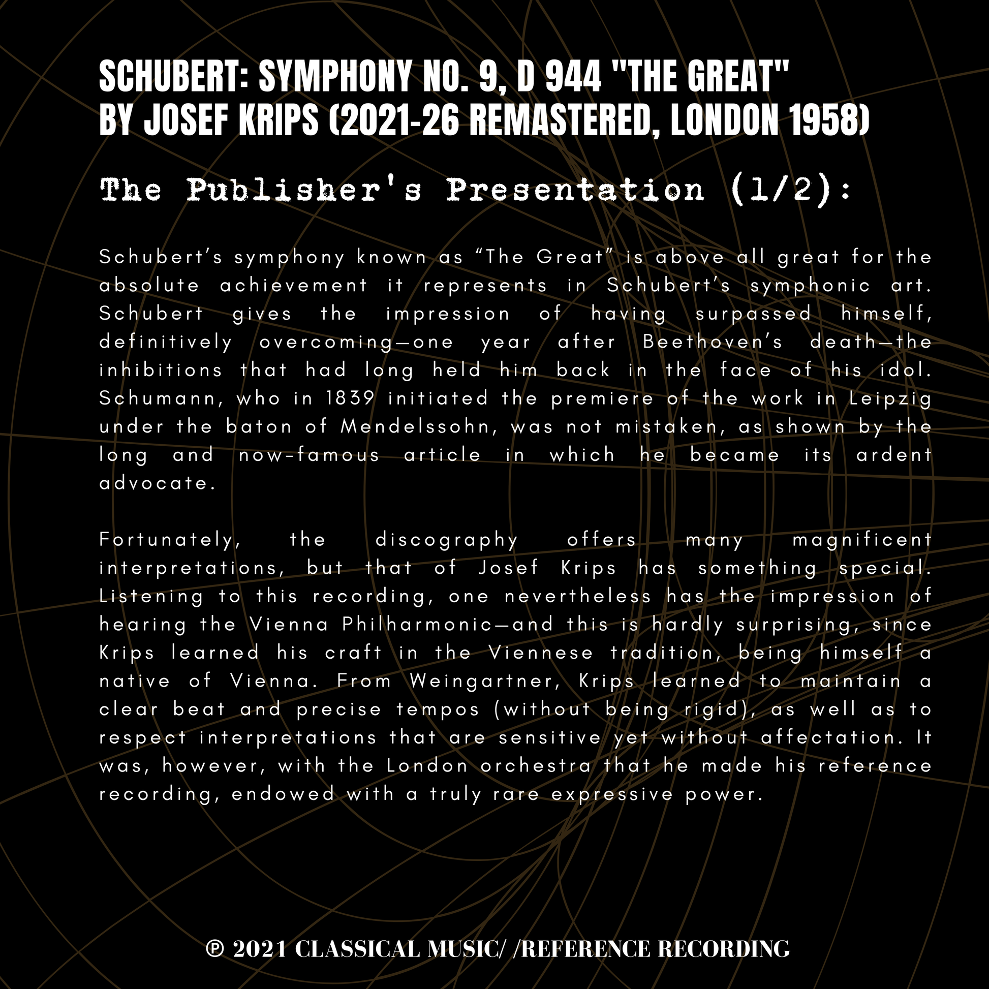 Fortunately, the discography offers many magnificent interpretations, but that of Josef Krips has something special. Listening to this recording, one nevertheless has the impression of hearing the Vienna Philharmonic—and this is hardly surprising, since Krips learned his craft in the Viennese tradition, being himself a native of Vienna. From Weingartner, Krips learned to maintain a clear beat and precise tempos (without being rigid), as well as to respect interpretations that are sensitive yet without affectation. It was, however, with the London orchestra that he made his reference recording, endowed with a truly rare expressive power.